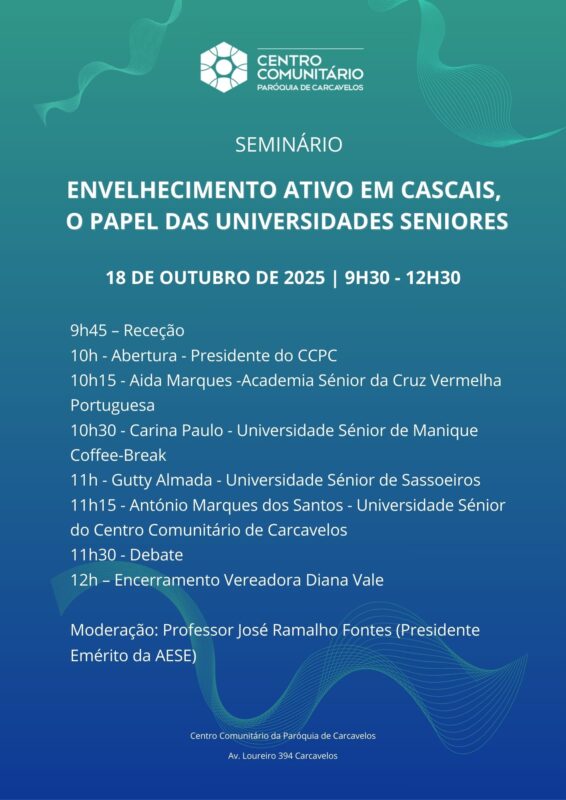 Este seminário pretende congregar as Universidades Seniores do Concelho de Cascais, no sentido de partilhar conhecimento acerca destas Instituições, nomeadamente: as dificuldades, as boas-práticas, e o impacto real que as Universidades Sénior têm nas respetivas comunidades, e principalmente que estratégias devem ser seguidas no futuro para melhorar o seu funcionamento.